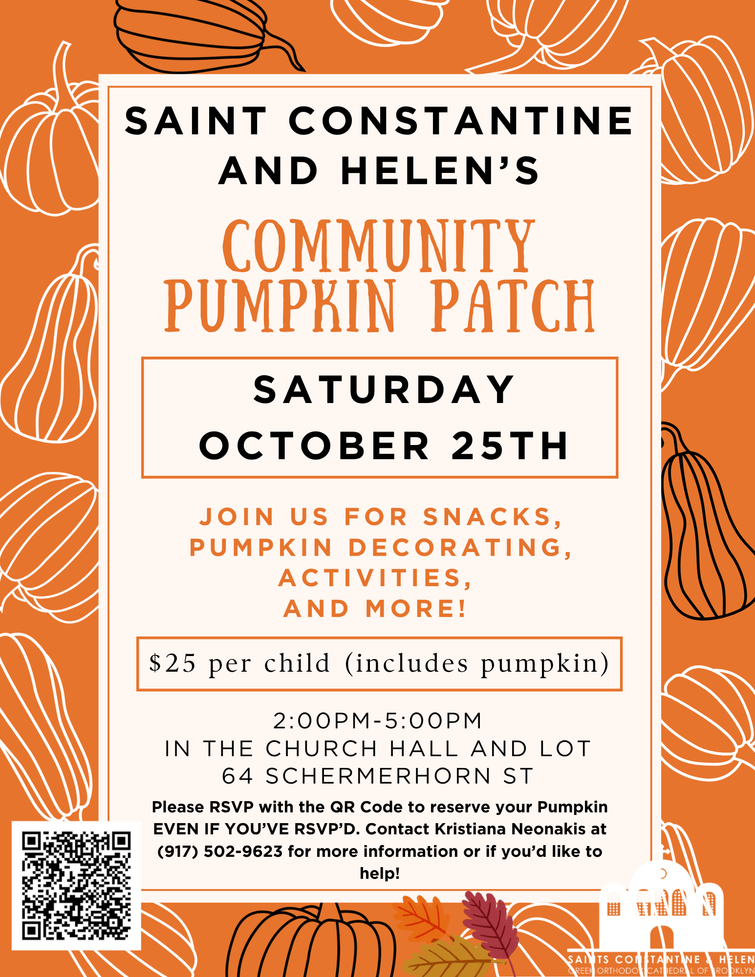 Bring your family and friends for snacks, pumpkin decorating, and a variety of activities for our kids. The cost is $25 per child (no charge for parents!), which includes all activities and your own pumpkin to decorate and take home.