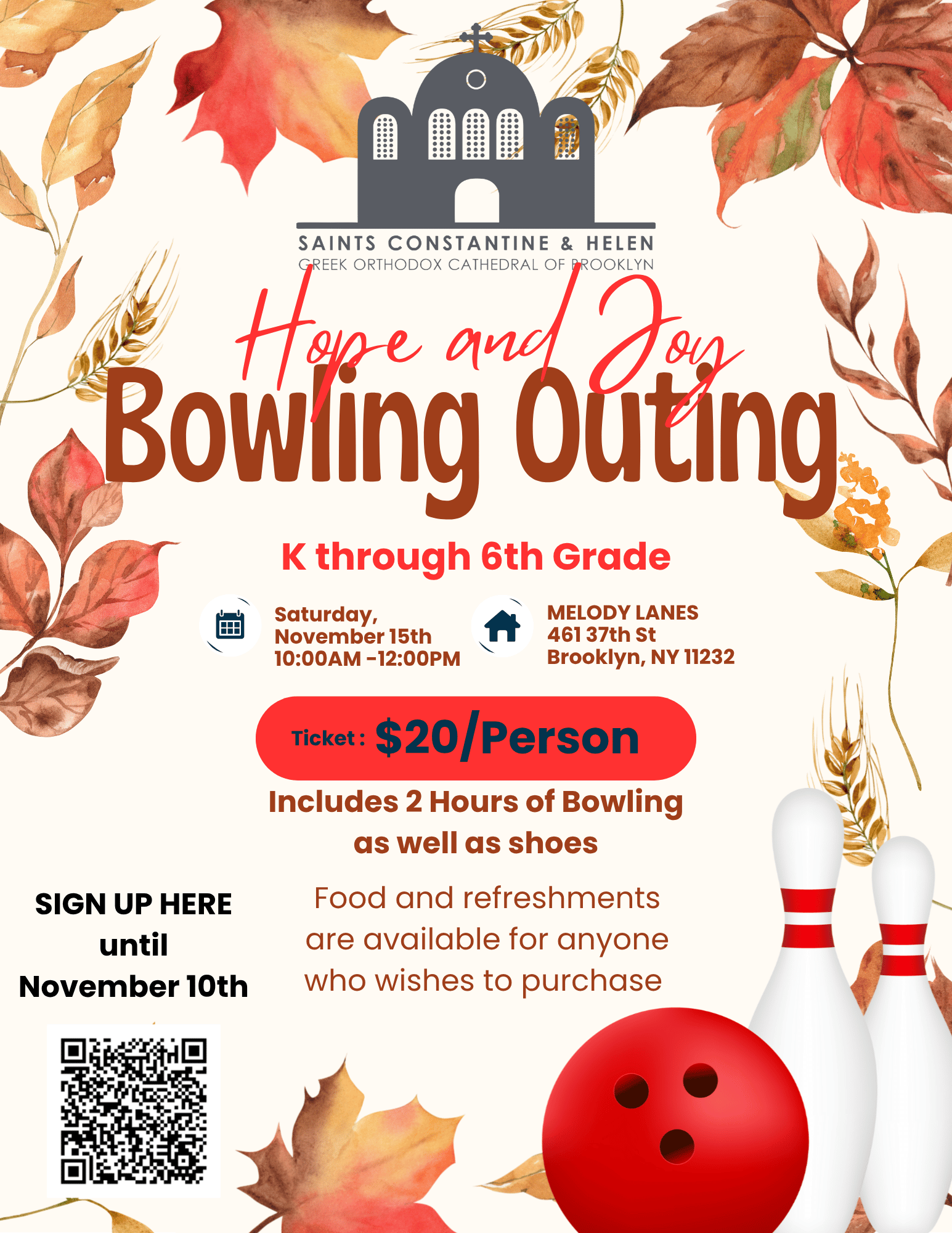 Join Saints Constantine & Helen’s Hope and Joy for a fun morning of bowling! This event is perfect for children in Kindergarten through 6th grade and their families.