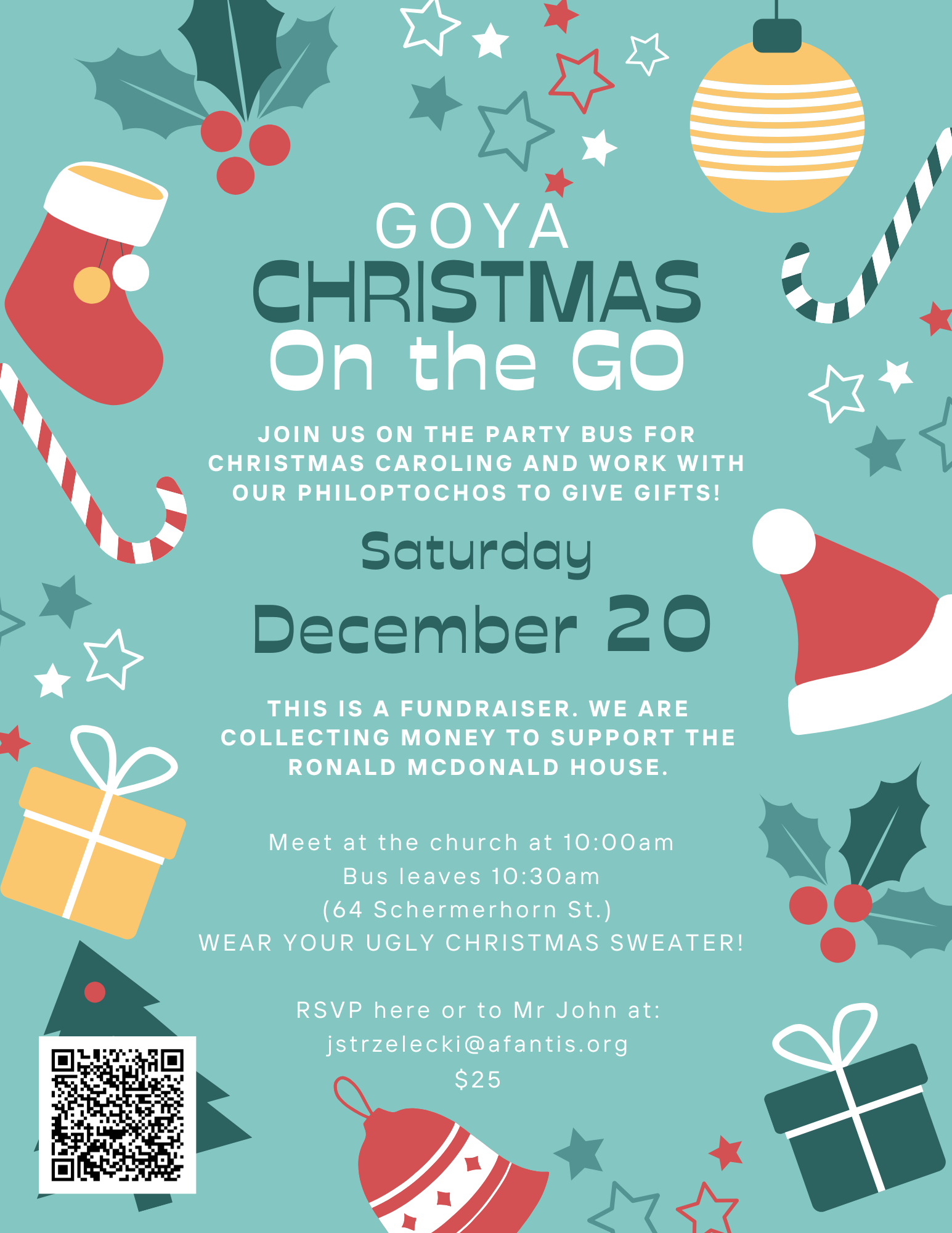 All GOYANs (7th -12th grade) are invited to celebrate the season for our GOYA Christmas Party “Christmas on the Go,” a day of faith, fun, and service. On Saturday, December 20, we will travel together by party bus for Christmas caroling and will partner with our Philoptochos to deliver gifts to members of our community. Lunch is included! This event is a fundraiser, with proceeds going to support the Ronald McDonald House.