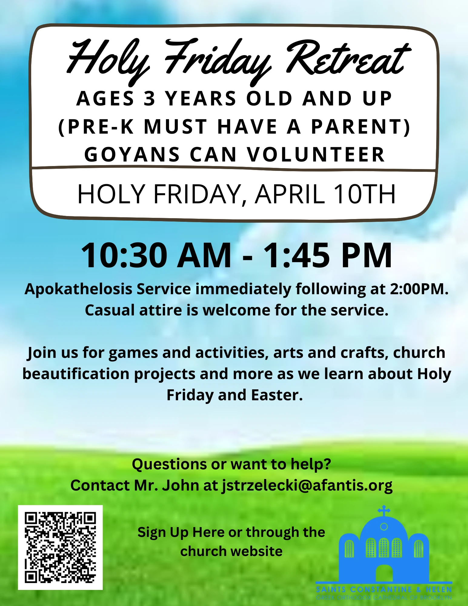 Join us for a meaningful Holy Friday Youth Retreat at Saints Constantine and Helen Cathedral on Friday, April 10th from 10:30 AM to 1:45 PM in the Church Hall. The day will conclude with the Apokathelosis Service at 2:00 PM, which families will attend together.