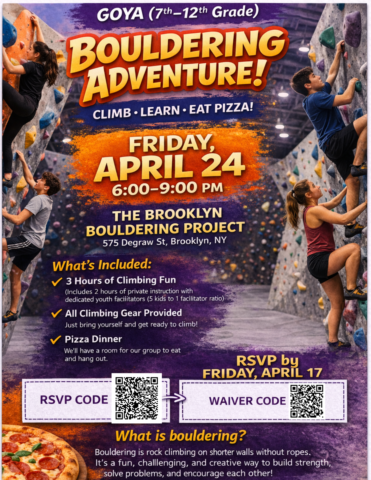 Join us for a GOYA Bouldering Adventure on Friday, April 24, from 6:00 to 9:00 PM at The Brooklyn Bouldering Project, located at 575 Degraw Street in Brooklyn. Open to students in 7th through 12th grade, this will be a fun evening of climbing, learning, and spending time together as a group.